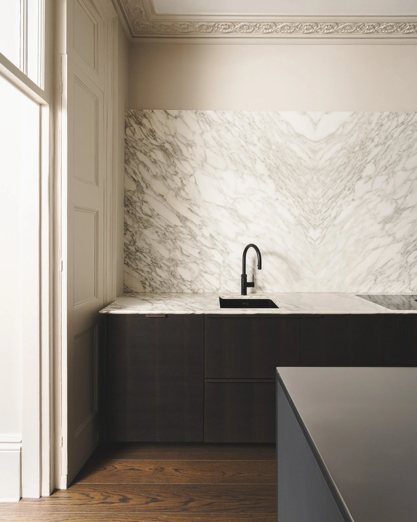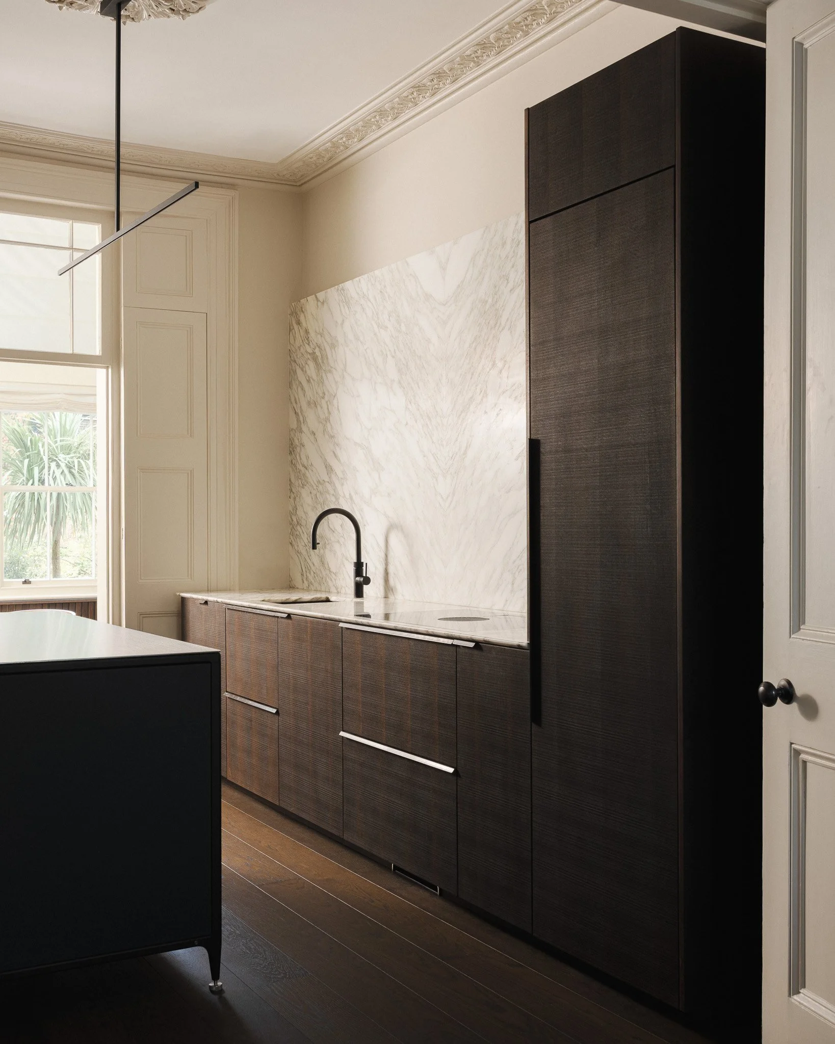 An island in the centre of the space takes material cues from the existing marble fireplace and surrounds. Designed with the period setting of the house in mind, it is detailed in a freestanding way resembling a standalone furniture piece. A marble worktop and high splashback mirror existing materials around the fireplace. The height of the splashback exaggerated to add a sense of grandness to the space. Joinery on either side of the fireplace is kept low so as not to detract from it.