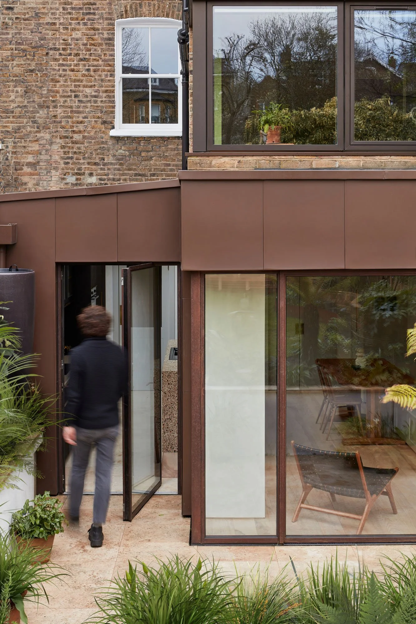 The newness of modern materials culminates in the external view of the garden elevation, where a two-storey addition clad in zinc presents as a stacked volume housing the new bathroom and study. This is finished in a warmer tone than standard cool zinc to complement the interior. Corten landscape planters line the perimeter, and a large rainwater pipe harvests water from the roof and re-distributes this throughout the garden