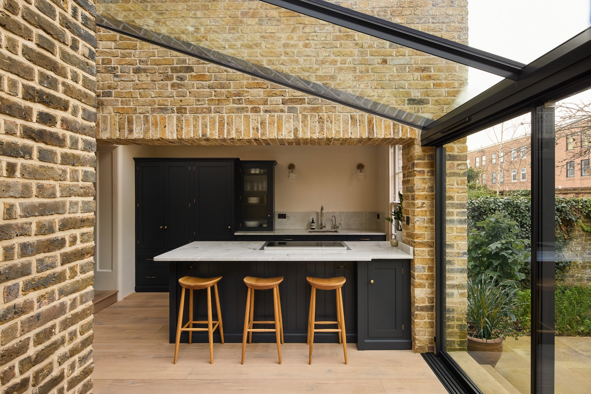 Our glazed extension to a Grade II Listed terraced house in Stoke Newington wraps around the original structure, framing historic brickwork in transparency and creating a dialogue between past and present.