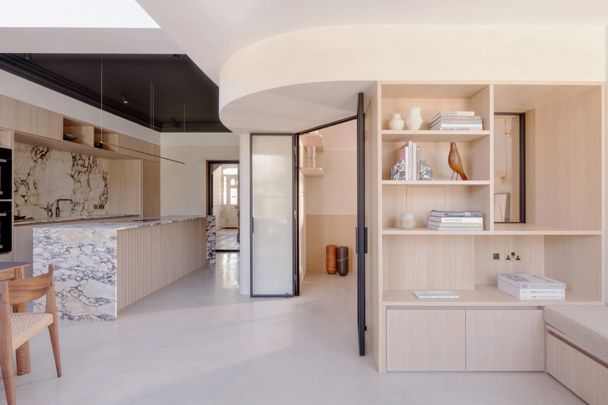 Externally, the façade was carefully preserved and restored: sash windows were refurbished, brickwork repointed, and period details reinstated. The new interventions feel neither pastiche nor starkly modern. Instead, they settle into the home with quiet confidence — sympathetic in tone, sculptural in form, and timeless in feel.