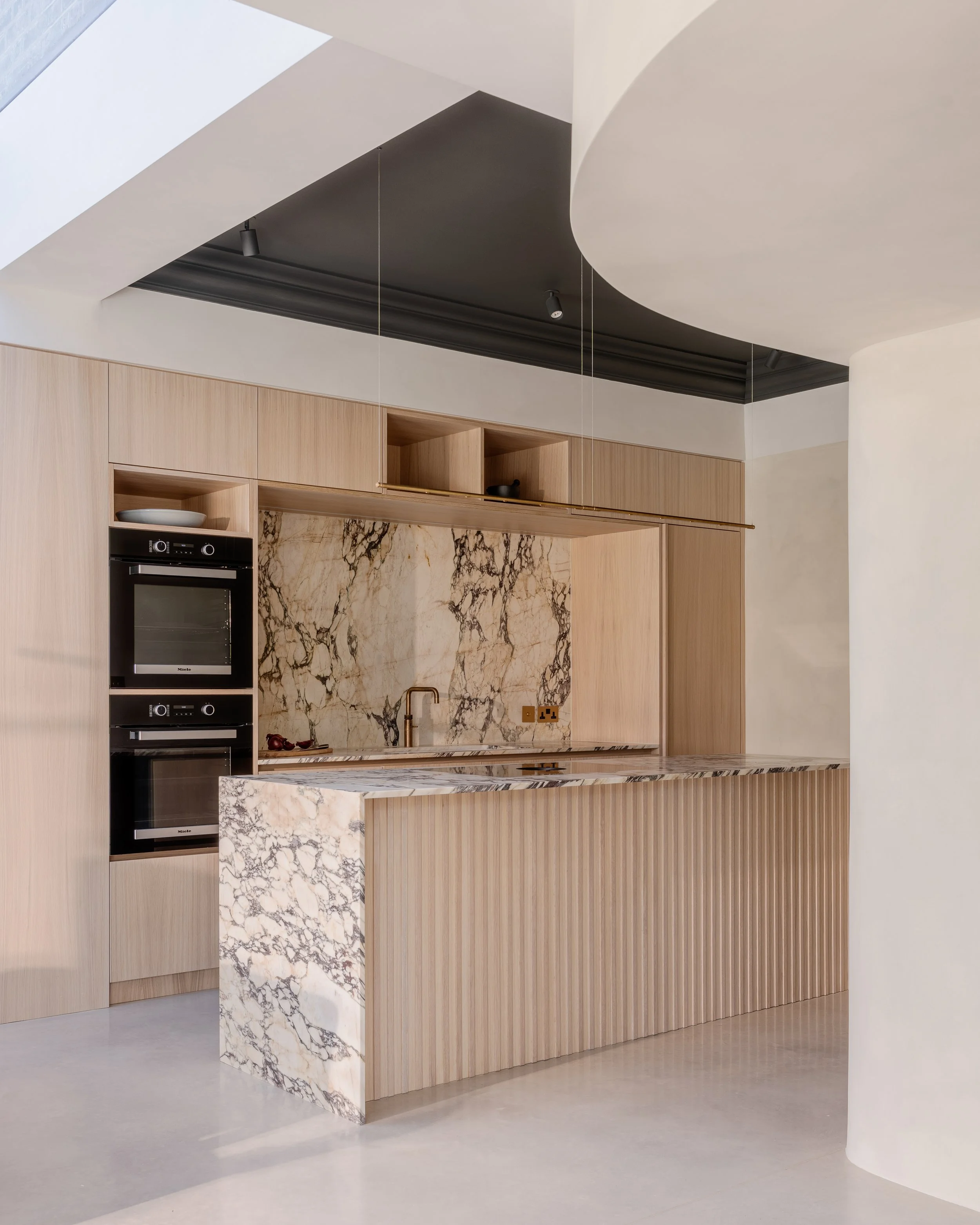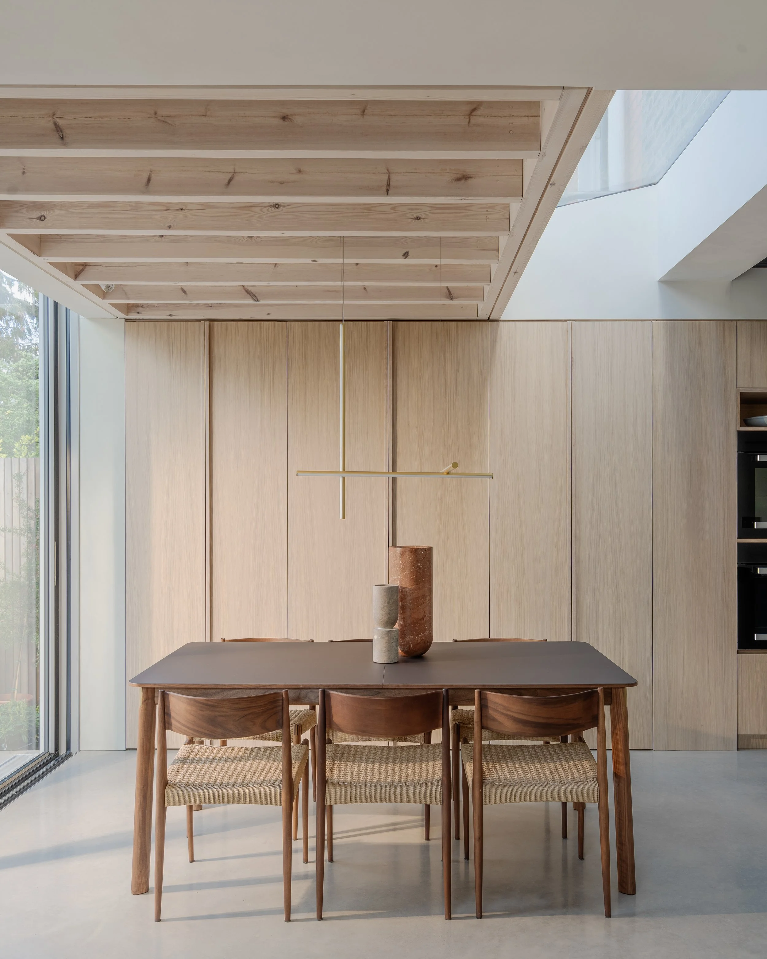 Internally, exposed glue-laminated beams draw warmth into the ceiling, breaking up the volume and controlling acoustics across the open-plan space. Above the kitchen, a rooflight pulls daylight deep into the plan, washing over marble worktops and pale oak cabinetry. These touches elevate the everyday — softening light, quieting echo, and framing life in motion.