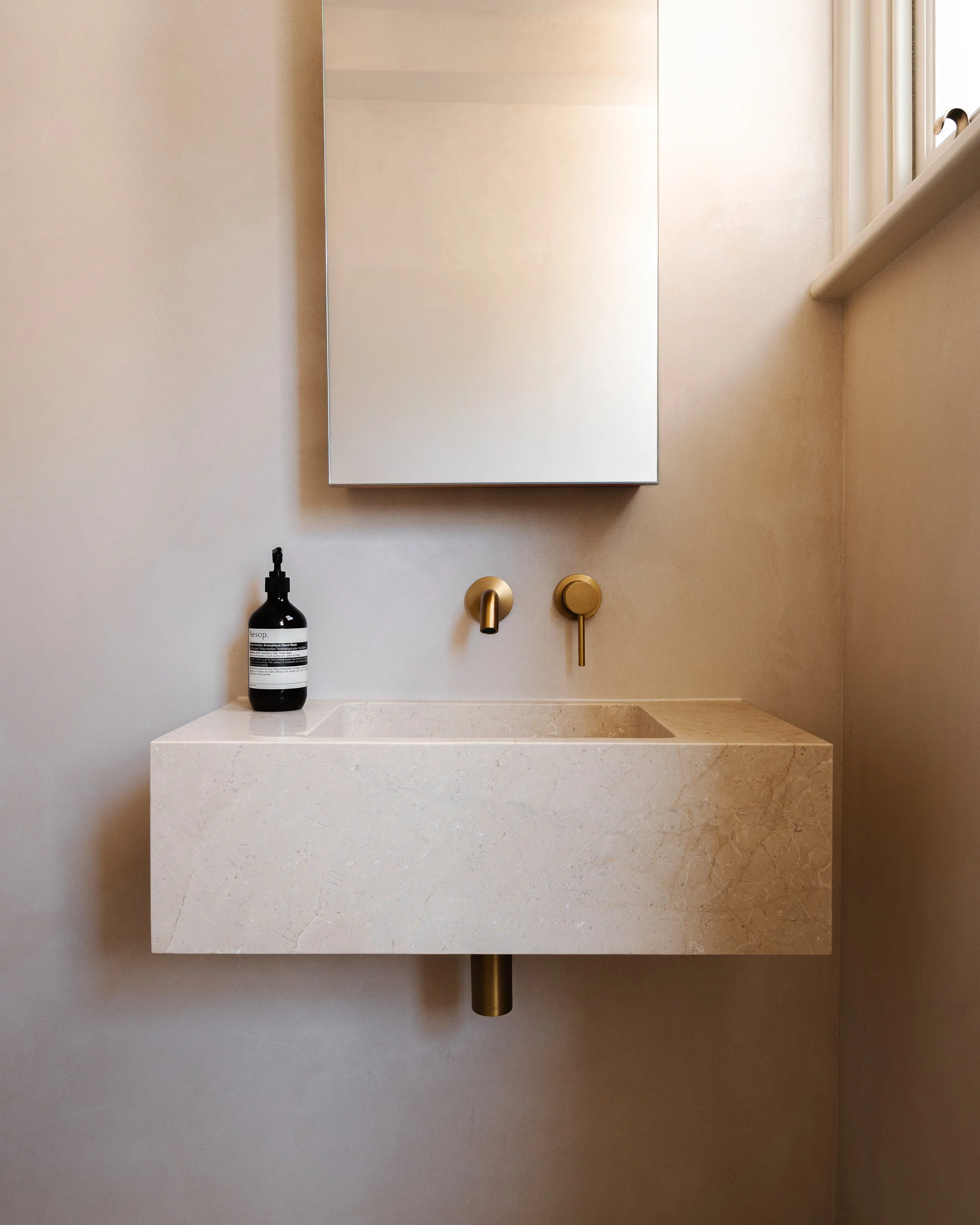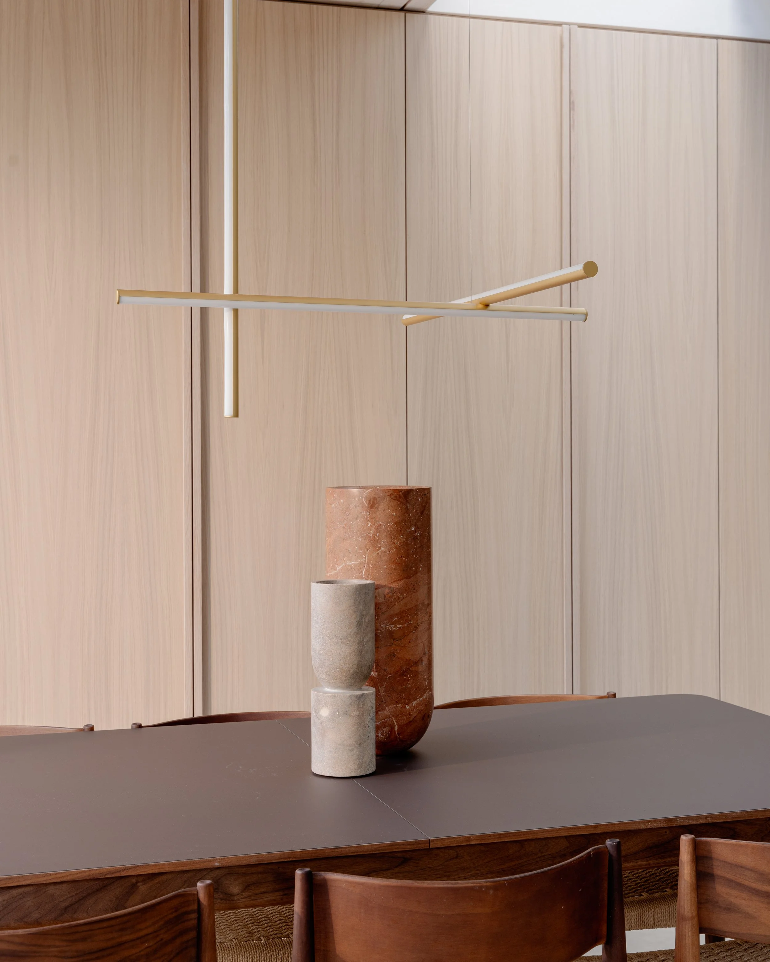 The main central space is enhanced with bespoke joinery and refined natural materials, a narrative that flows throughout the home. Plentiful storage is a functional necessity for a burgeoning family unit and is found intuitively wherever it’s needed.